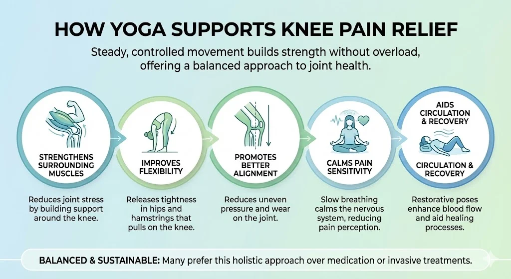 Yoga has gained attention as a gentle and effective option for knee pain relief. Public discussions from mid 2025 to early 2026 show strong support for yoga as a low impact practice that helps reduce pain, improve movement, and strengthen muscles without stressing the joints.