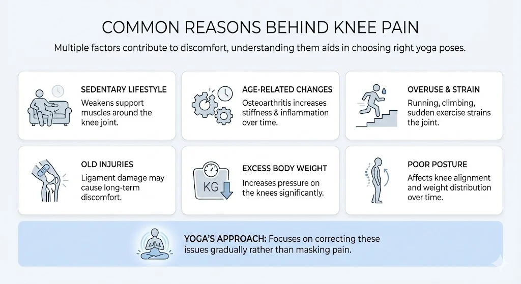 Knee pain often develops due to multiple factors working together. Understanding these causes helps in choosing the right yoga poses.