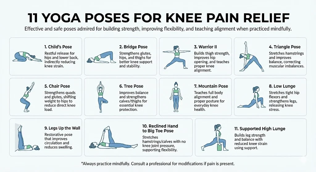 When practiced regularly and safely, these eleven yoga poses can support knee pain relief, improve mobility, and help maintain long term joint health.