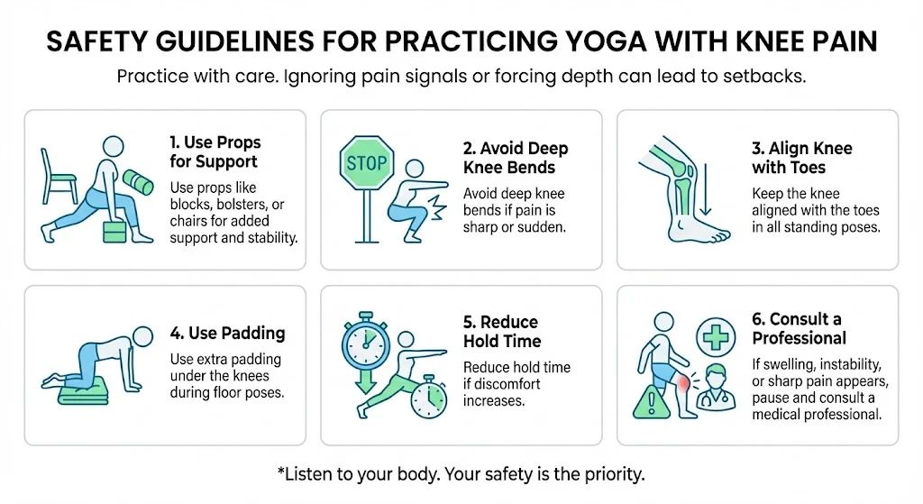 Yoga is safe for knee pain when practiced with care. Ignoring pain signals or forcing depth can lead to setbacks.