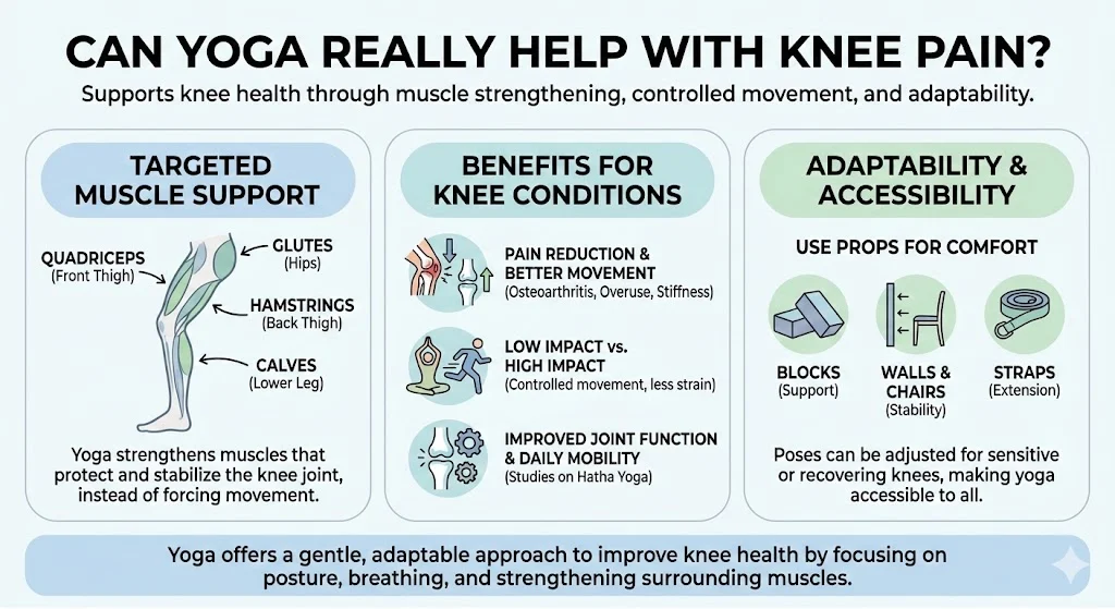 Recent public feedback and research based discussions show that yoga supports knee health in multiple ways. Instead of forcing the joint to move, yoga works on the muscles that protect the knee. These include the quadriceps, hamstrings, glutes, hips, and calves.