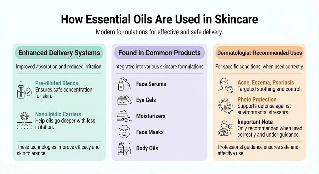 Essential oils are now used in many skin products. Pre diluted blends and nanolipidic carriers help oils go deeper into the skin with less irritation.