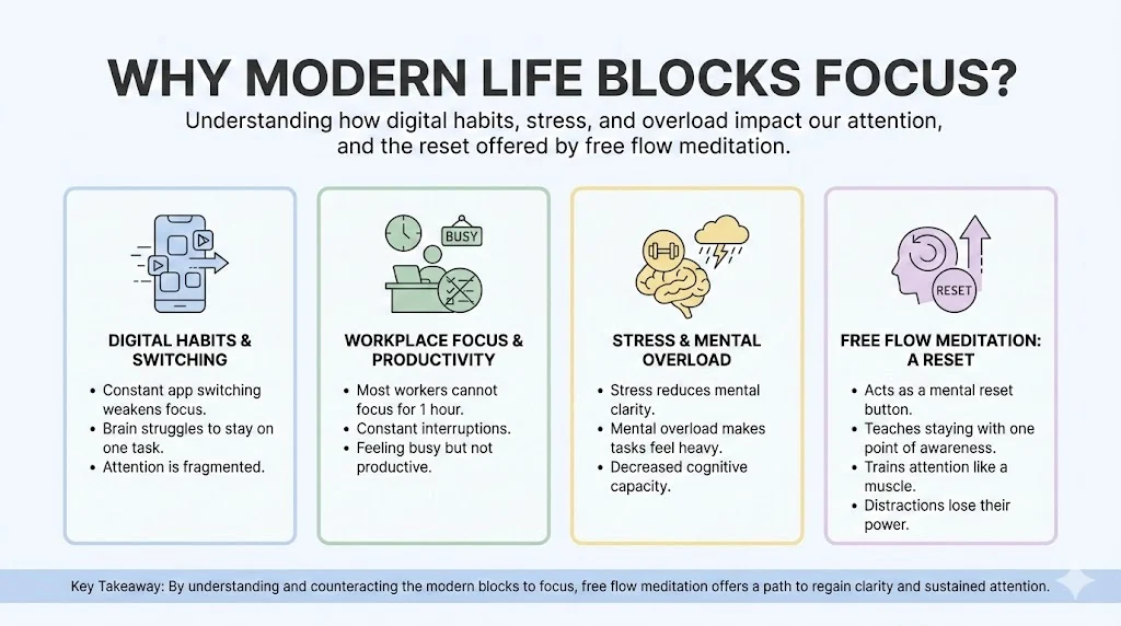 Free flow meditation acts as a reset button. It teaches the mind to stay with one point of awareness. This trains attention like a muscle. With practice, distractions lose their power.