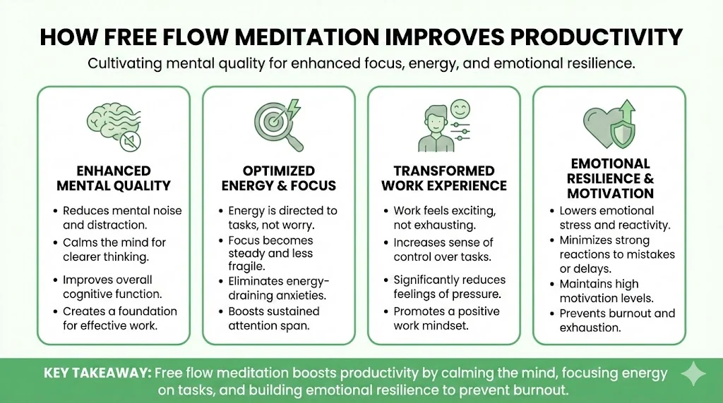 Productivity is not only about time management. It is about mental quality. Free flow meditation improves productivity by reducing mental noise. When the mind is calm, energy is used only for the task and not for worry.