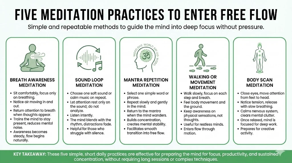 These five meditation practices show that free flow does not require long sessions or complex techniques. Short daily use of any one method can prepare the mind for focus, productivity, and sustained concentration.