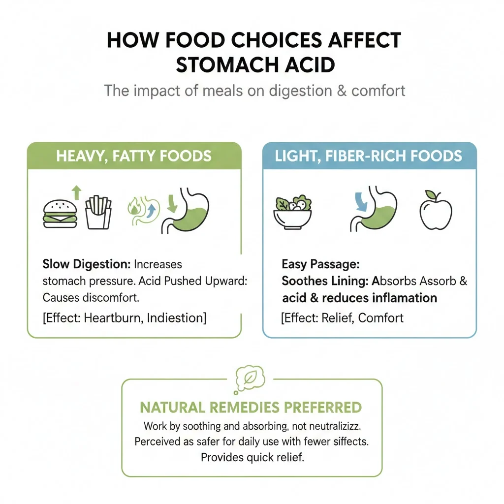 Food directly controls how much acid the stomach produces and how strongly it reacts. Heavy and fatty meals slow digestion. This increases pressure inside the stomach and pushes acid upward. On the other hand, light and fiber rich foods pass easily through the digestive system.