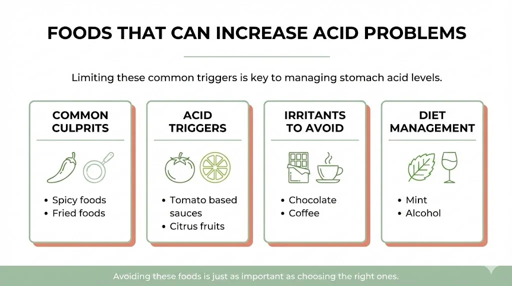 Some foods increase stomach acid and should be limited: