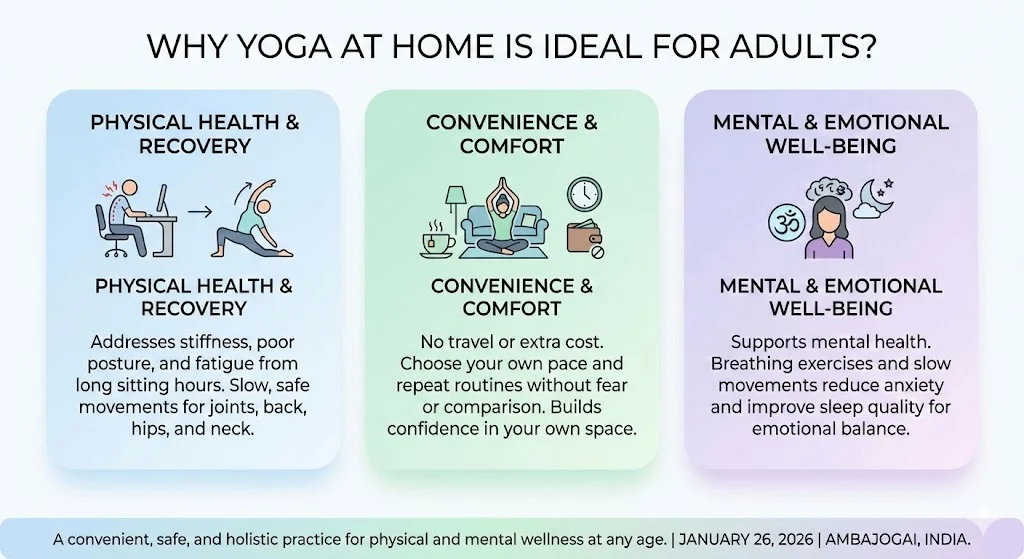 Adults often deal with stiff joints, poor posture, and mental fatigue. Long sitting hours affect the back, hips, and neck. Yoga at home allows people to move their bodies slowly and safely without travel or cost.