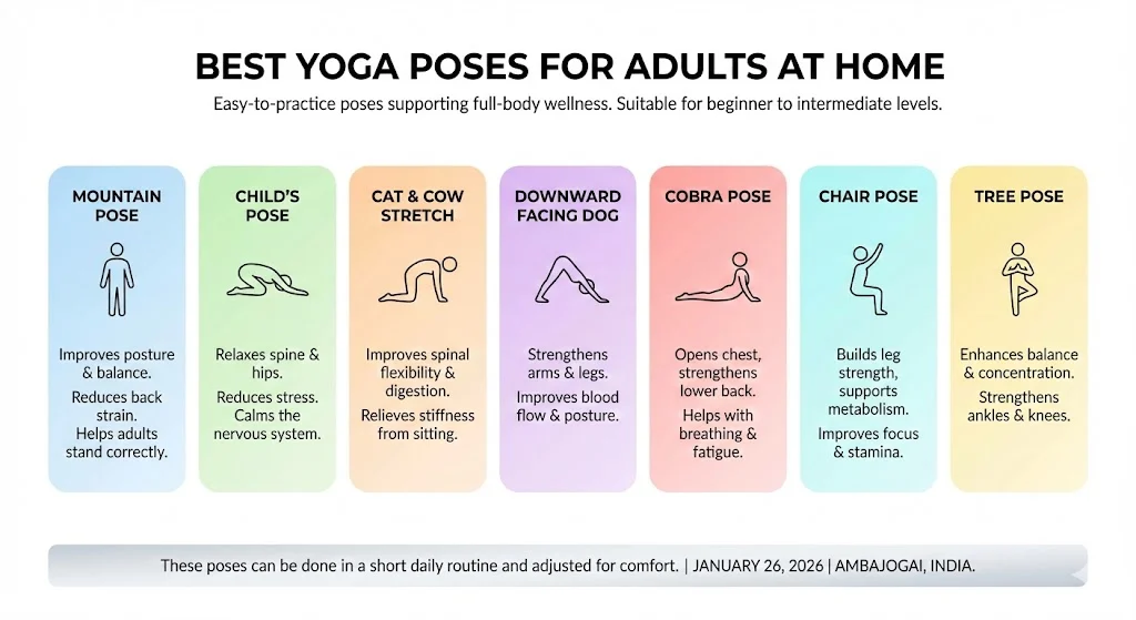 Yoga at home has become one of the most trusted wellness habits for adults in 2025 and 2026. Busy schedules, long screen hours, and rising stress levels have pushed many people to look for simple routines that can be done without a studio or equipment. Adults now prefer short and gentle sessions that improve flexibility, reduce back pain, and calm the mind.