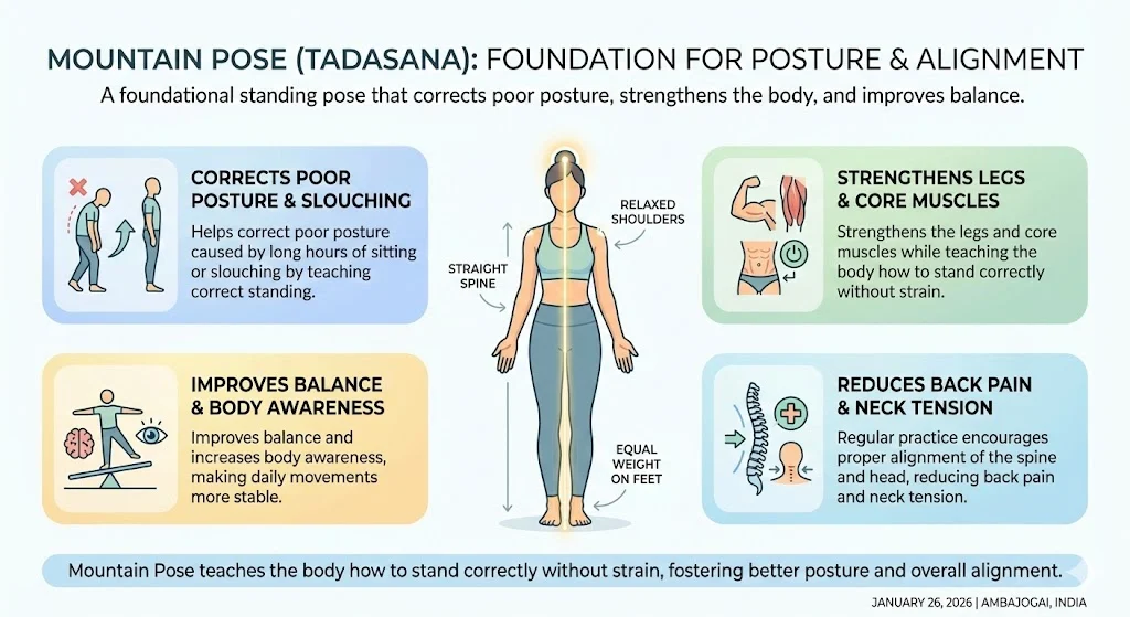This helps correct poor posture caused by long hours of sitting or slouching. Mountain Pose strengthens the legs and core muscles while teaching the body how to stand correctly without strain. It also improves balance and body awareness. Regular practice can reduce back pain and neck tension by encouraging proper alignment of the spine and head.