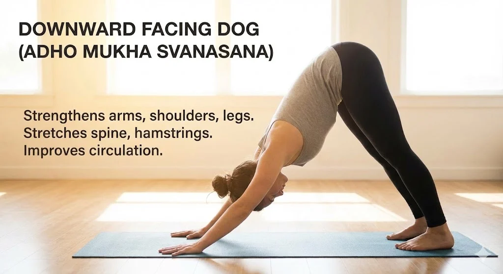 Downward Facing Dog is a full body posture that strengthens the arms, shoulders, and legs while stretching the spine and hamstrings. It improves blood circulation by placing the heart slightly above the head, which helps refresh the brain and reduce fatigue.