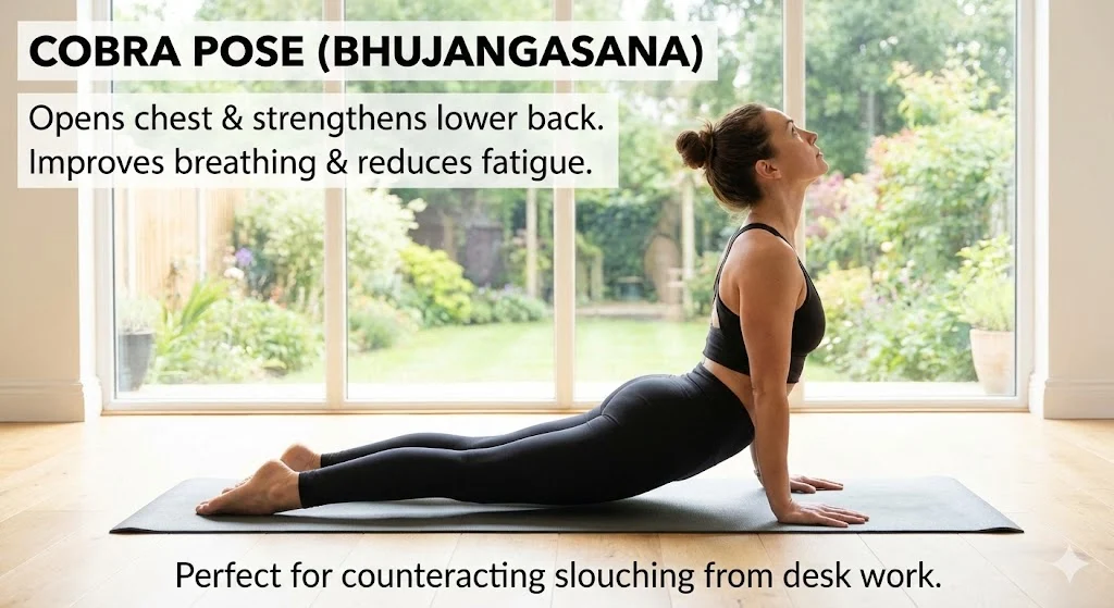 Cobra Pose gently opens the chest and strengthens the muscles of the lower back. This posture counteracts the effects of slouching and rounded shoulders caused by desk work. By lifting the chest and expanding the lungs, it improves breathing capacity and increases oxygen flow to the body.