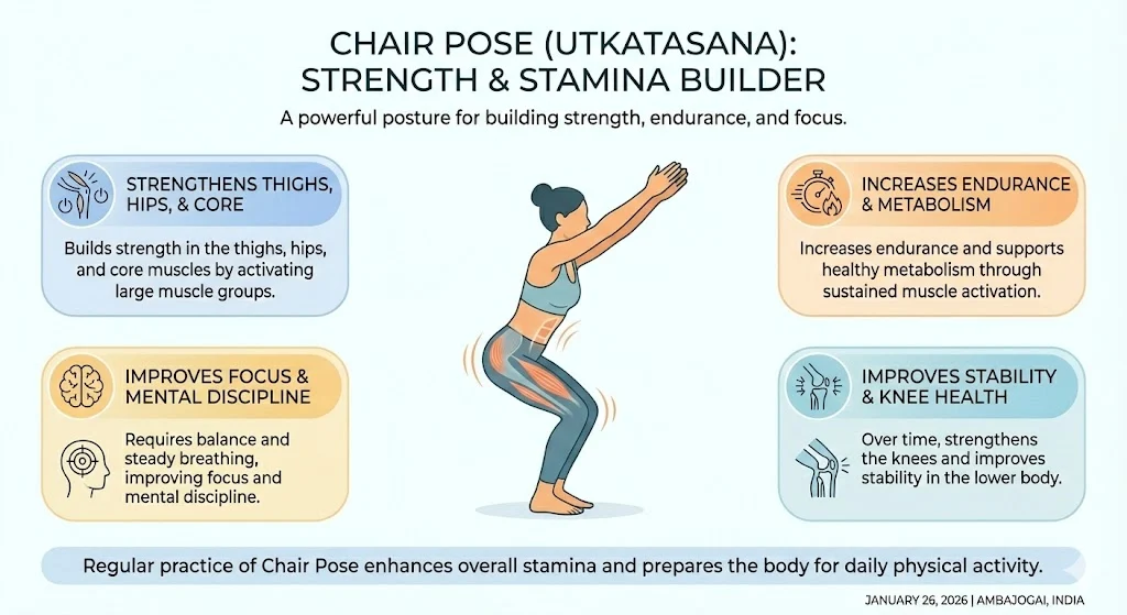 Chair Pose is a powerful posture that builds strength in the thighs, hips, and core muscles. It increases endurance and supports healthy metabolism by activating large muscle groups.