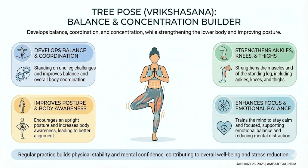 This pose also improves posture and body awareness. Tree Pose trains the mind to stay calm and focused, which supports emotional balance and stress control. Regular practice builds confidence and stability both physically and mentally. It is especially helpful for improving attention and reducing mental distraction.